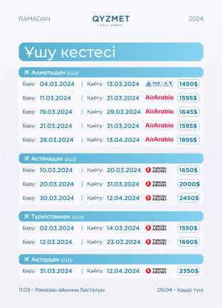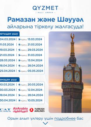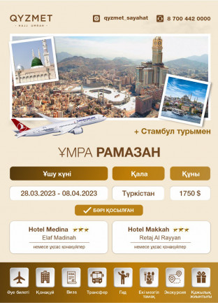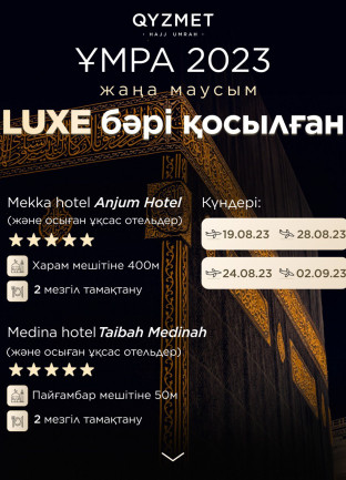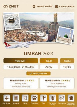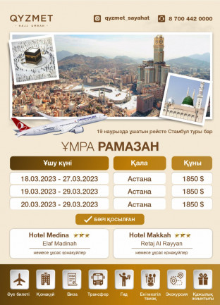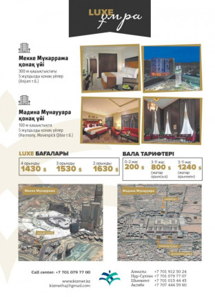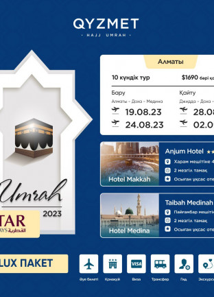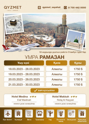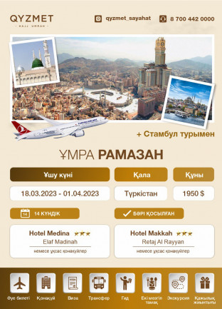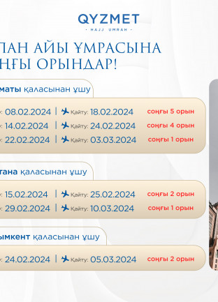 «Qyzmet Sayahat» — это туристическая компания, которая обладает множеством преимуществ по сравнению с подавляющим числом конкурентов на рынке. Мы работаем с 2006 года и стали одной из первых компаний в Казахстане, организующих Умра/Хадж туры для мусульман.