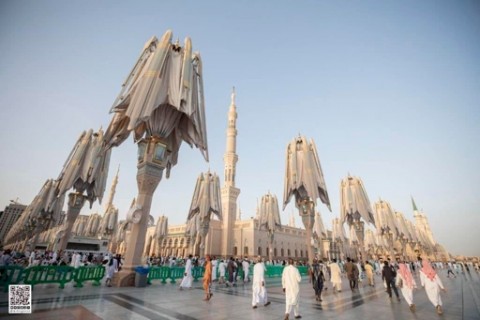 Дворы Масджид аль-Набави покрывают 250 зонтов, которые работают со сбалансированной автоматической системой, защищающей от солнечного зноя и дождя. Высота одного зонта 15,3 и 14,4 м, а вес одного зонта 40 тонн.